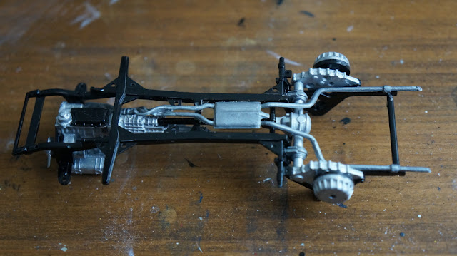 ラダーフレームにエンジン、ギヤボックス、デフ等組み付け